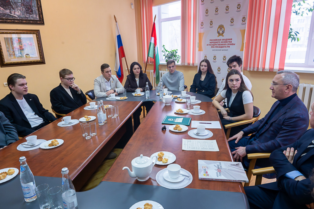 Тема встречи — «Калужская область: твоя территория возможностей». Модератором обсуждения выступил директор вуза Павел Самылов, который обратил внимание, что в 2026 году Калужскому филиалу Президентской академии исполняется 30 лет.