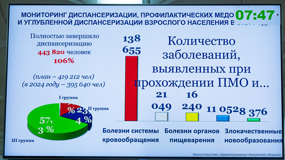 В 2025 году диспансеризацию взрослого населения прошло более 443 тысяч человек, что на 48 тысяч больше по сравнению с предыдущим годом. По итогам число граждан с первой группой здоровья составило 19,3%, со второй группой здоровья — 23,4%, с третьей группой — 57,3%.
