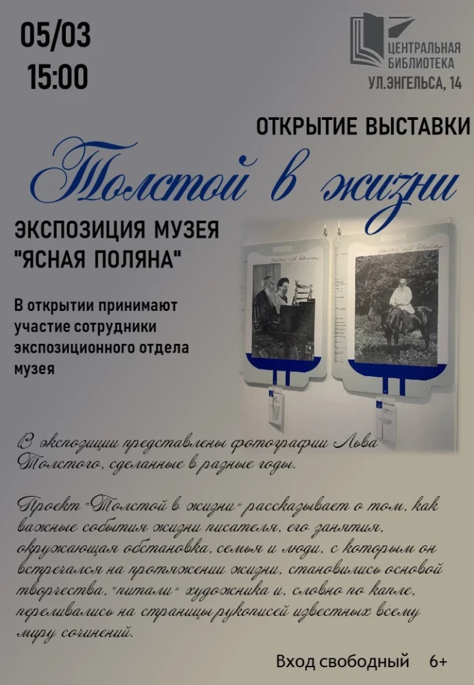5 марта в 15:00 в Центральной городской библиотеке города Обнинска (ул. Энгельса, 14) состоится открытие выставки «Толстой в жизни». Экспозиционный проект рассказывает о том, как важные события жизни писателя, его занятия, окружающая обстановка, семья и люди, с которым он встречался на протяжении жизни, становились основой творчества, «питали» художника и, словно по капле, переливались на страницы рукописей известных всему миру сочинений. За годы напряженного труда Толстой черпал идеи для творчества отовсюду. Так, кавказские впечатления писателя легли в основу повестей «Казаки», «Хаджи-Мурат», комната для приезжающих, в которой Толстой работал над «Анной Карениной», стала кабинетом Левина в этом романе, а члены семьи Льва Николаевича – прототипами героев «Детства», «Утра помещика», «Войны и мира».