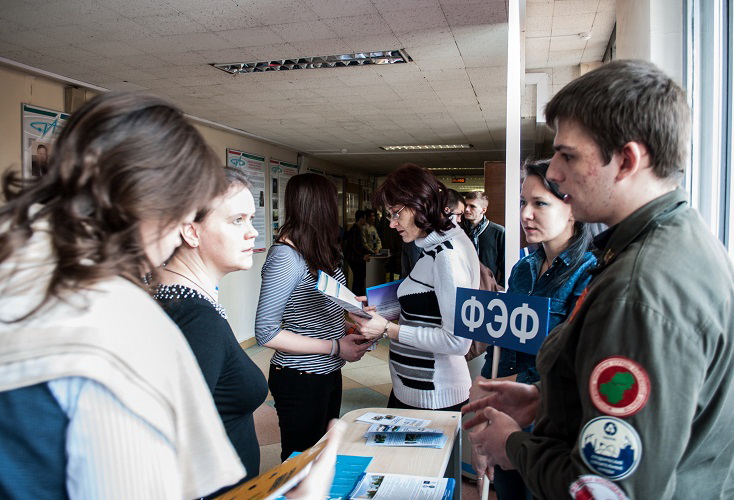 В коридоре второго этажа, по направлению к первому корпусу, можно было увидеть студентов различных кафедр за информационными стойками, подойдя к которым можно было получить всю необходимую информацию и взять брошюры.