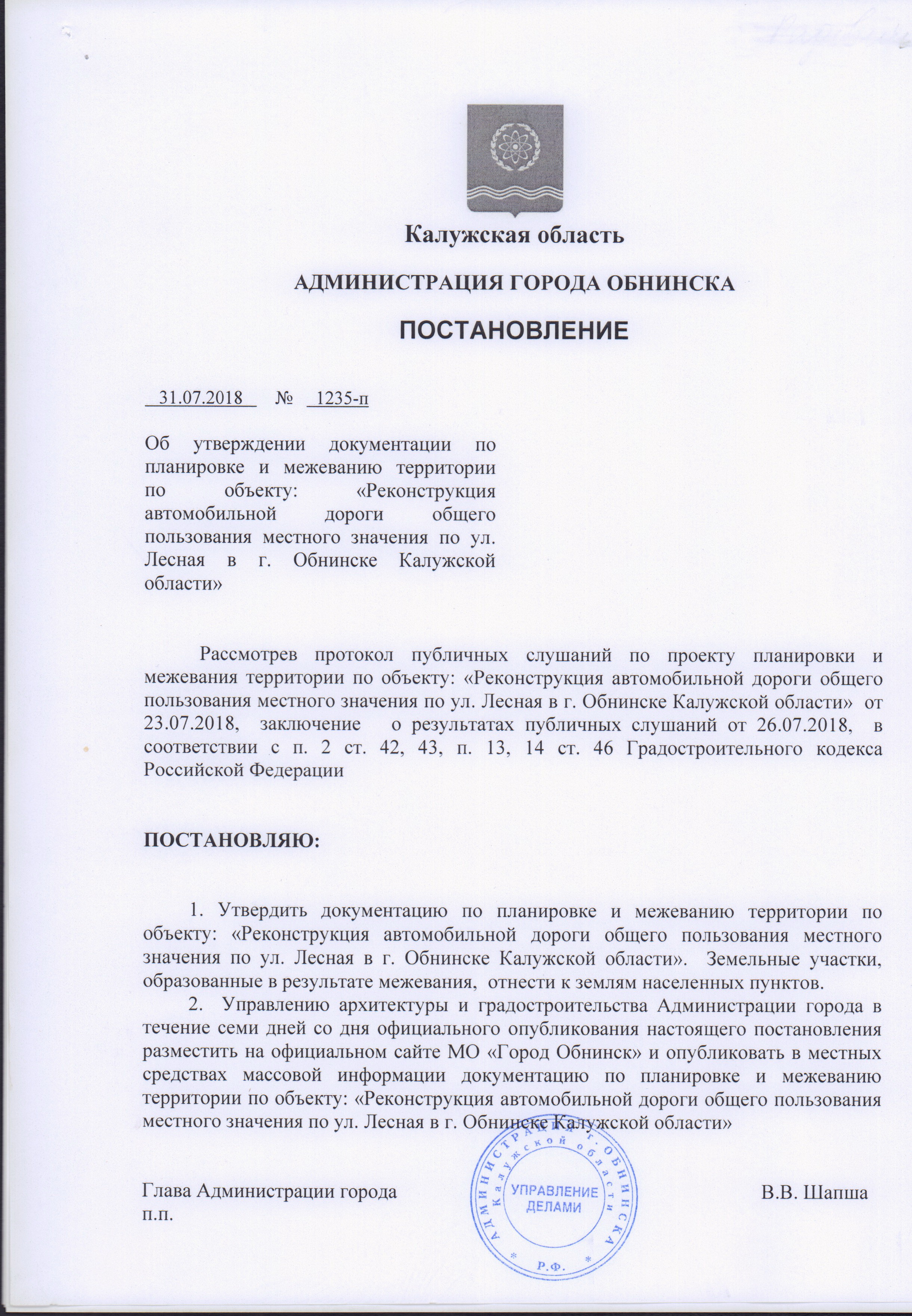 Постановление Администрации города №1235-п от 31.07.2018 "Об утверждении документации по планировке и межеванию территории по объекту: «Реконструкция автомобильной дороги общего пользования местного значения по ул. Лесная в г. Обнинске Калужской области»" (скачать)