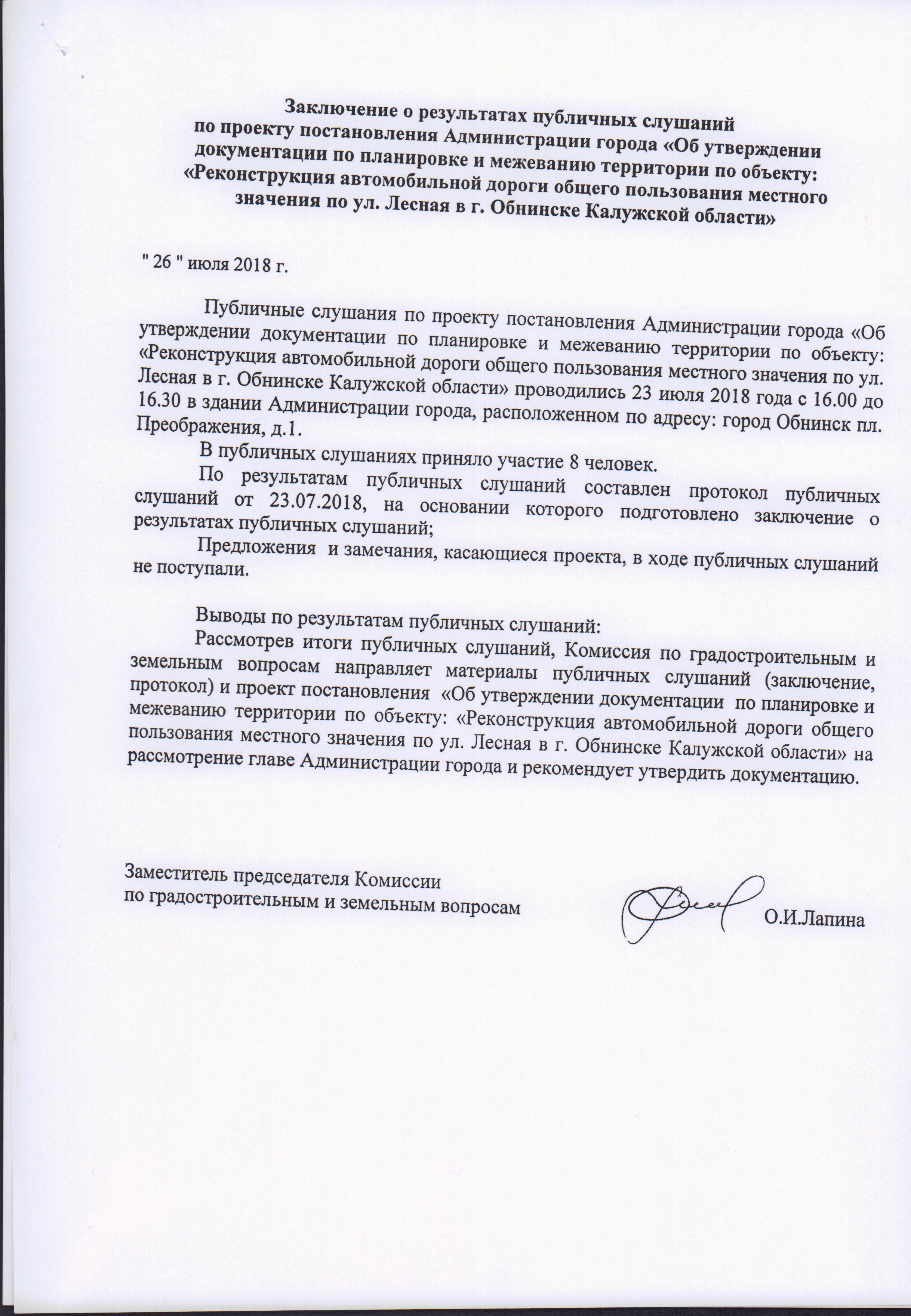 Заключение о результатах публичных слушаний по проекту постановления Администрации города «Об утверждении документации по планировке и межеванию территории по объекту: «Реконструкция автомобильной дороги общего пользования местного значения по ул. Лесная в г. Обнинске Калужской области» (скачать)