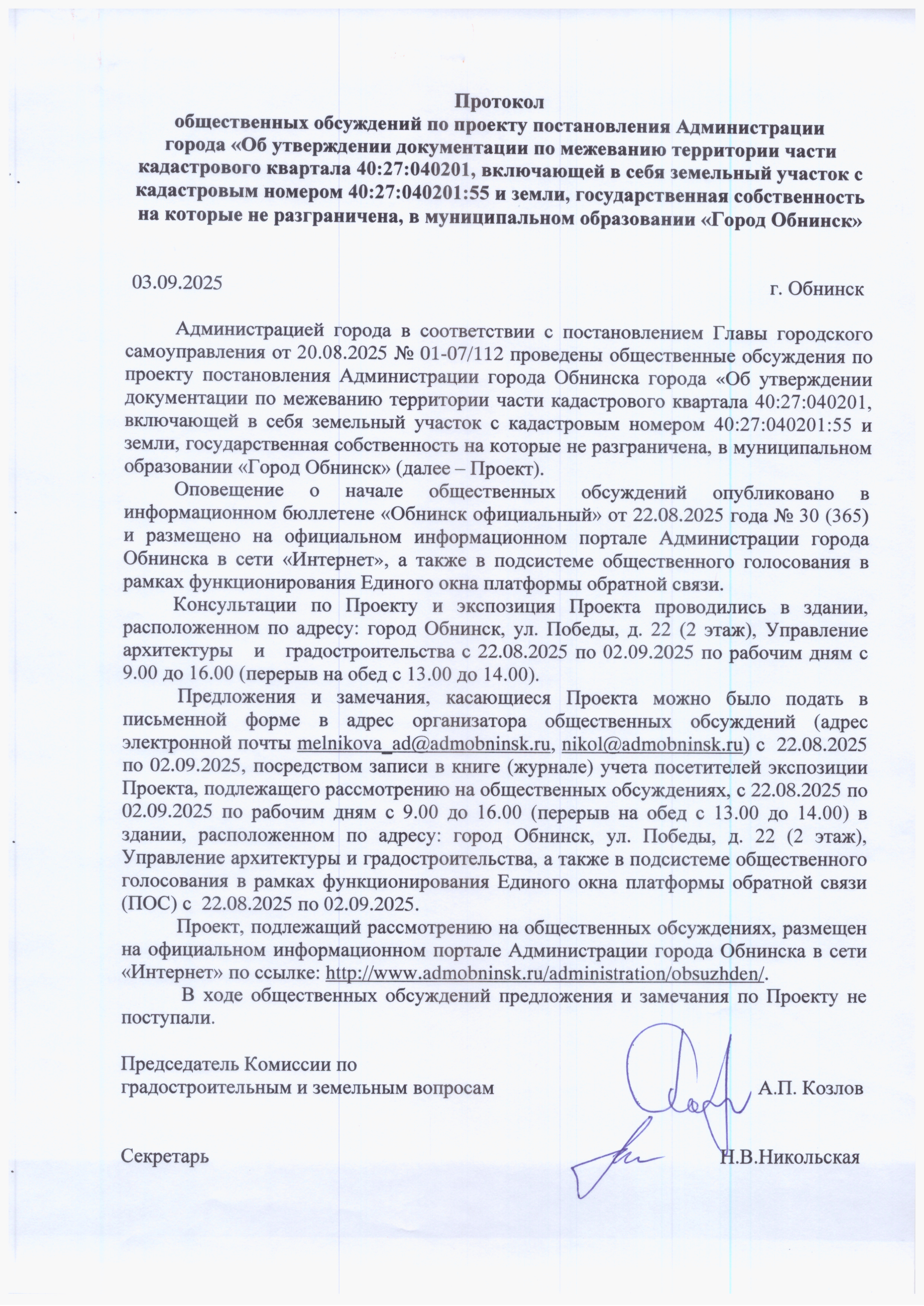 Протокол общественных обсуждений по проекту постановления Администрации города «Об утверждении документации по межеванию территории части кадастрового квартала 40:27:040201, включающей в себя земельный участок с кадастровым номером 40:27:040201:55 и земли государственная собственность на которые не разграничена, в муниципальном образовании «Город Обнинск»