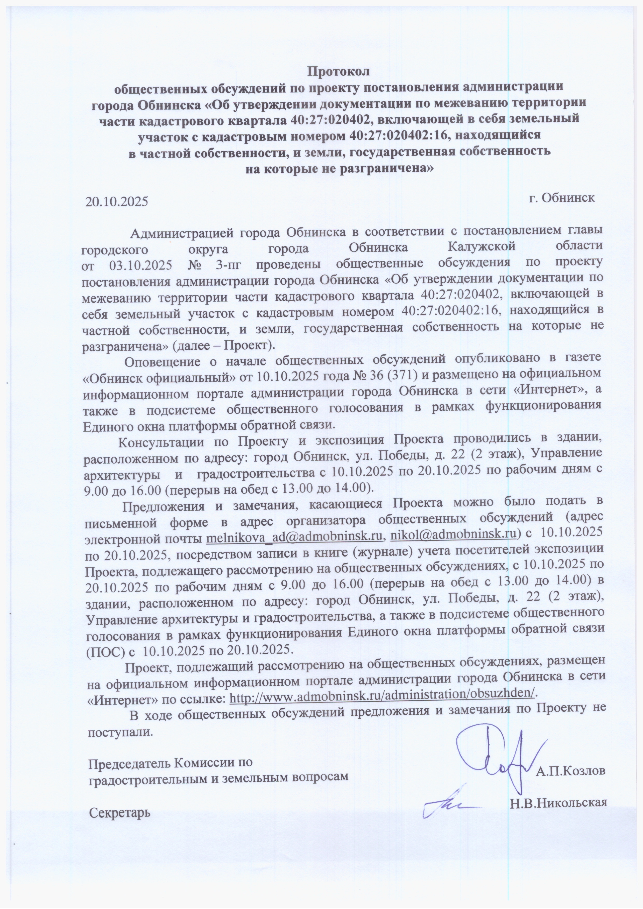 Протокол общественных обсуждений по проекту постановления администрации города Обнинска «Об утверждении документации по межеванию территории части кадастрового квартала 40:27:020402:16, находящийся в частной собственности, и земли, государственная собственность на которые не разграничена в муниципальном образовании «Город Обнинск»