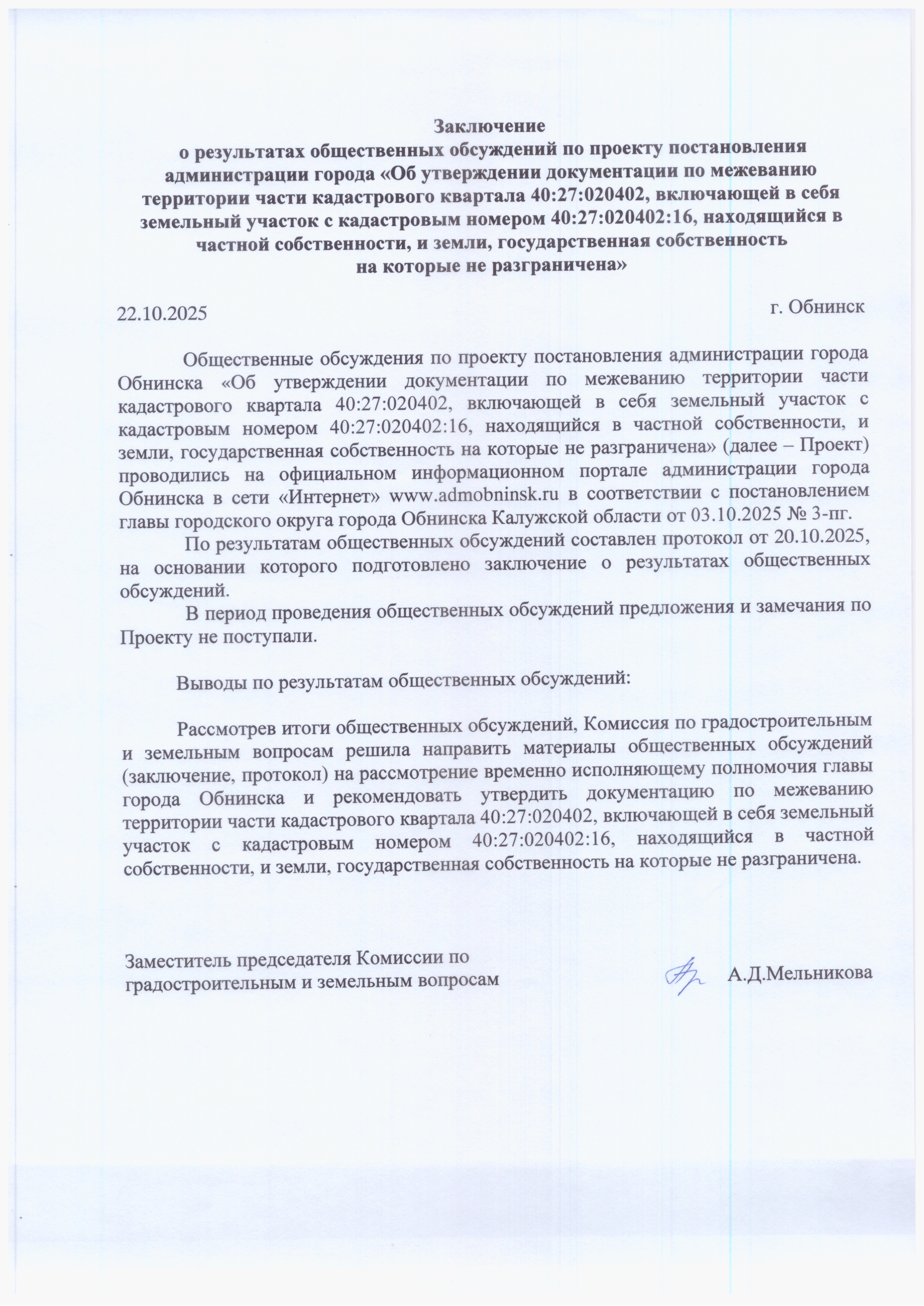 Заключение о результатах общественных обсуждений по проекту постановления администрации города Обнинска «Об утверждении документации по межеванию территории части кадастрового квартала 40:27:020402:16, находящийся в частной собственности, и земли, государственная собственность на которые не разграничена в муниципальном образовании «Город Обнинск»