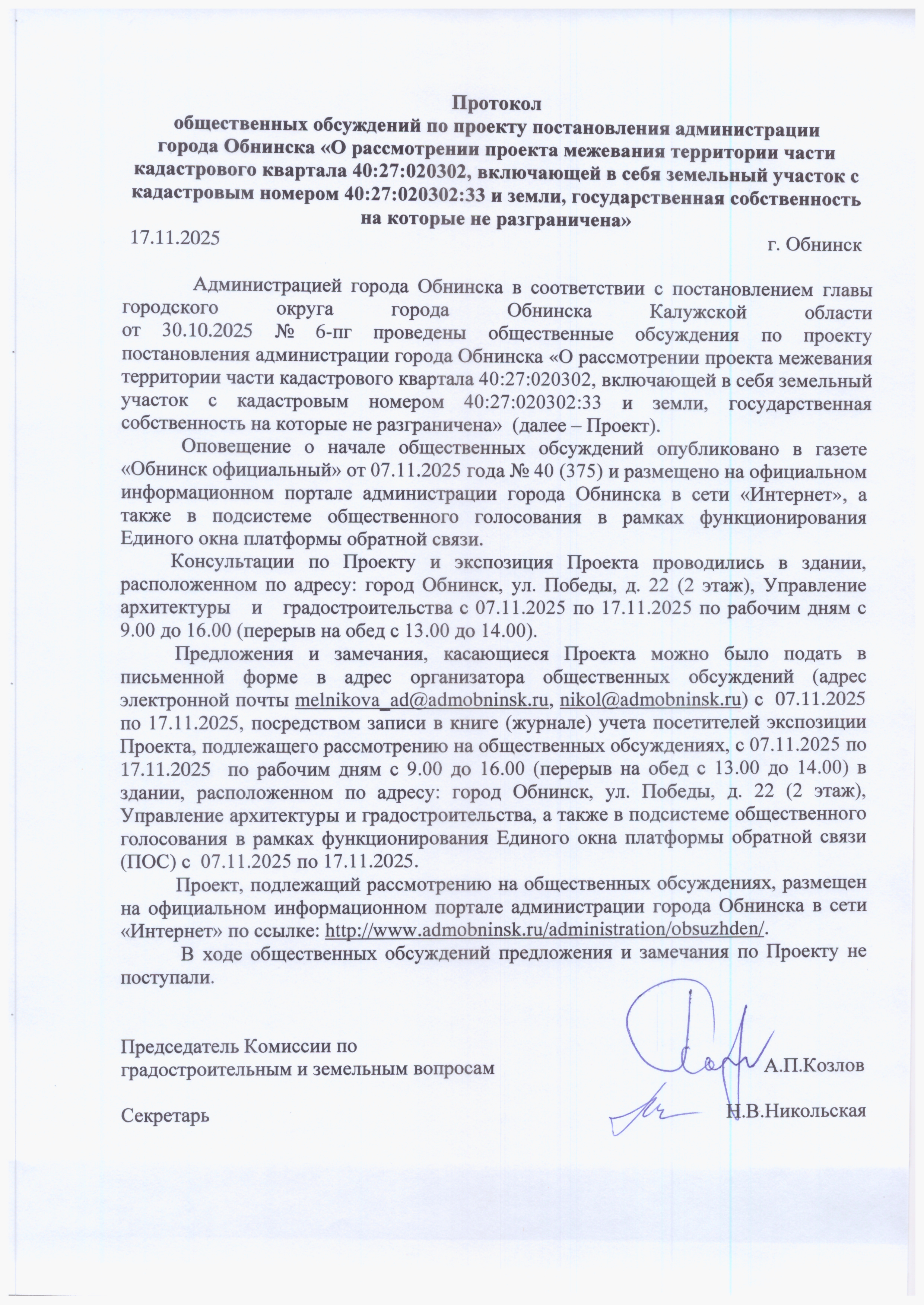Протокол общественных обсуждений по проекту постановления администрации города Обнинска «О рассмотрении проекта межевания территории части кадастрового квартала 40:27:020302, включающей в себя земельный участок с кадастровым номером 40:27:020302:33 и земли, государственная собственность на которые не разграничена»