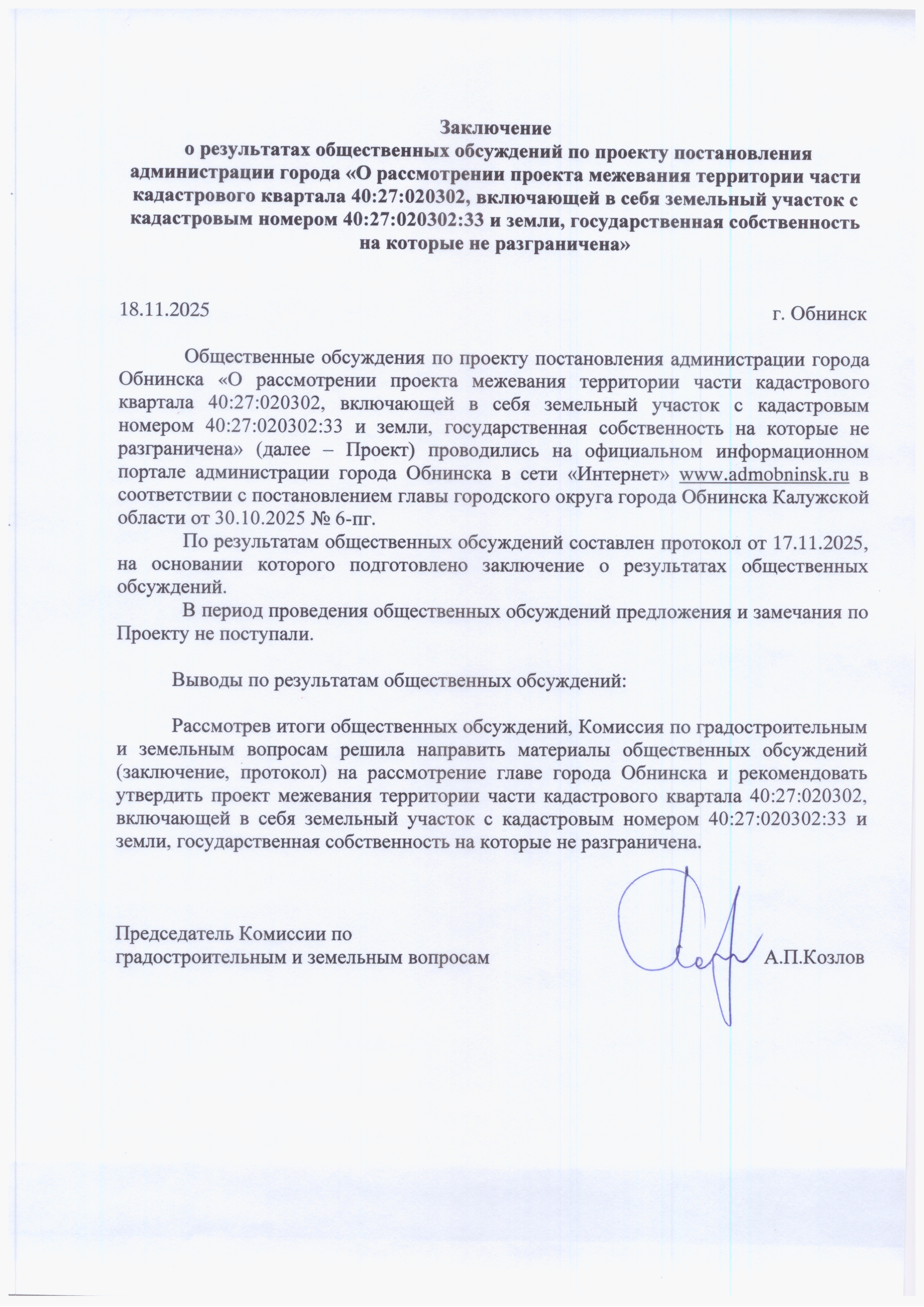 Заключение о результатах общественных обсуждений по проекту постановления администрации города Обнинска «О рассмотрении проекта межевания территории части кадастрового квартала 40:27:020302, включающей в себя земельный участок с кадастровым номером 40:27:020302:33 и земли, государственная собственность на которые не разграничена»