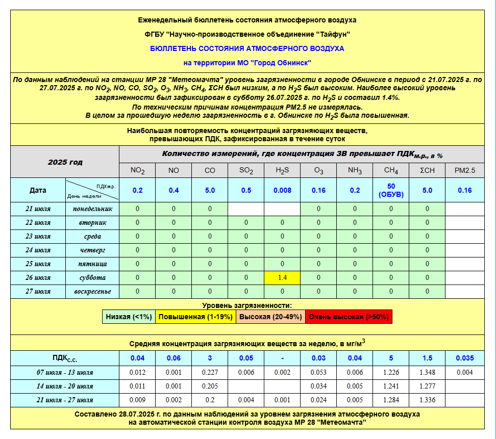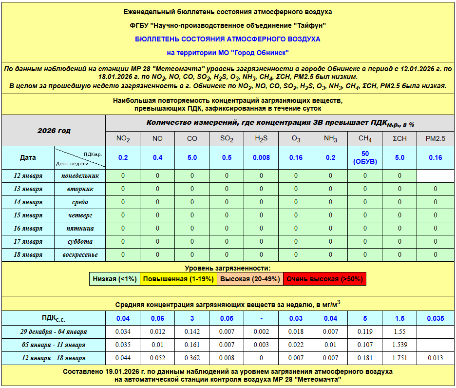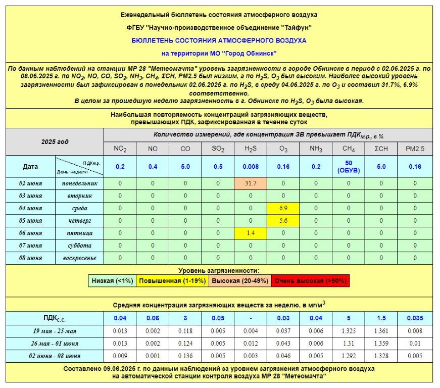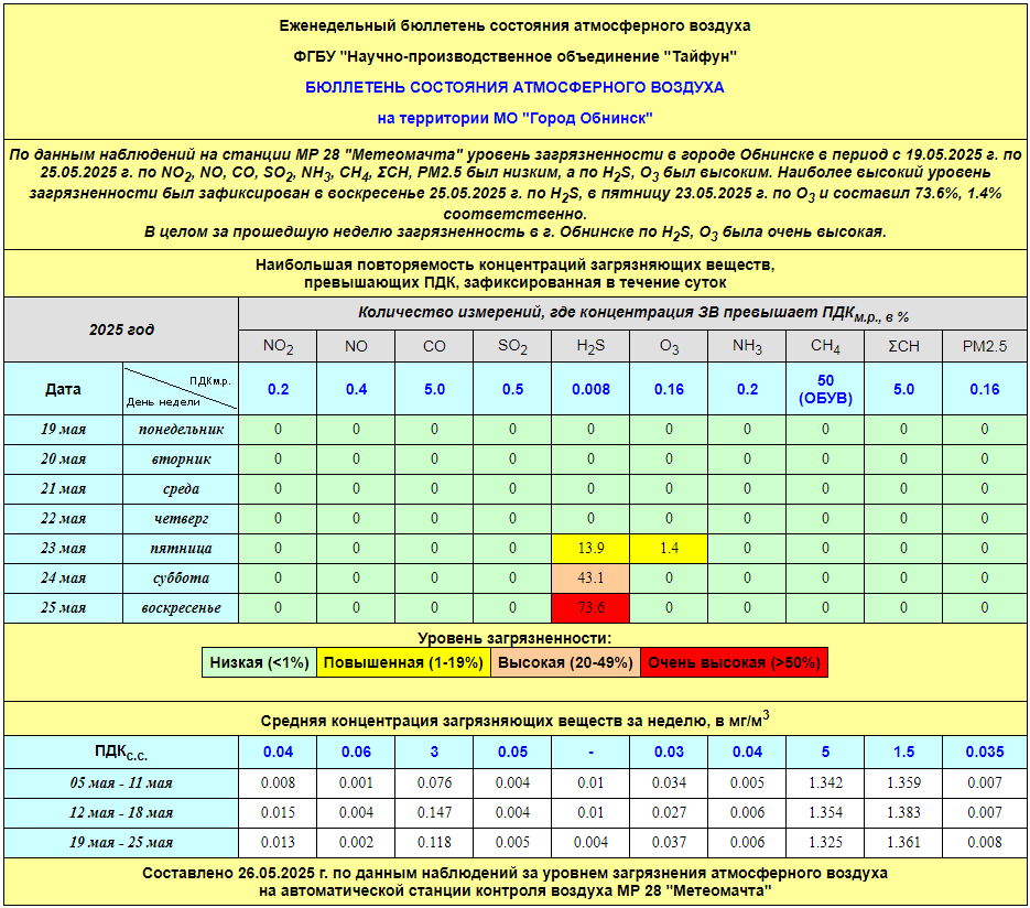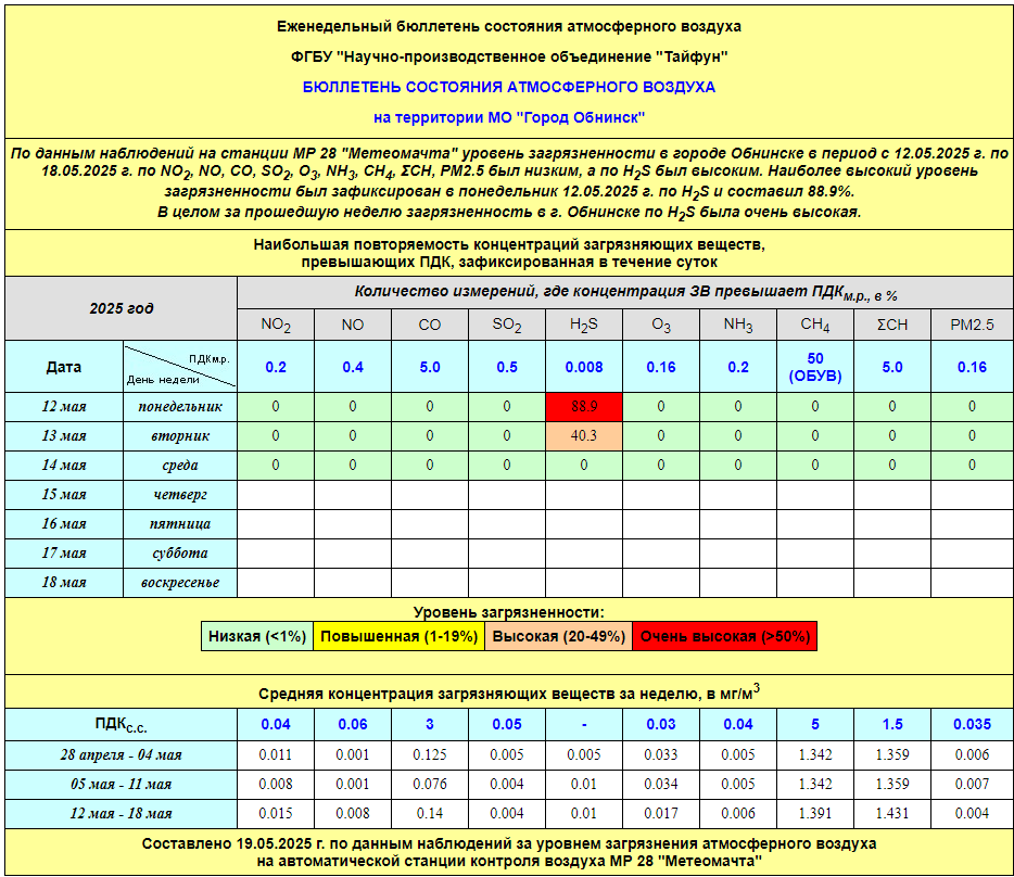 По информации, предоставленной ФГУП НПО «Тайфун», отмеченные в бюллетене состояния атмосферного воздуха на территории МО «Город Обнинск» превышения концентрации по H2S (сероводород) за период с 08.02.-12.02. связаны с некорректной работой прибора. В настоящее время проводятся работы по технической диагностике прибора.