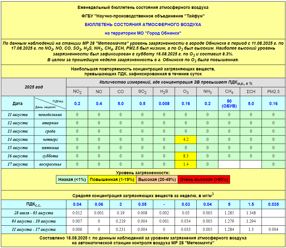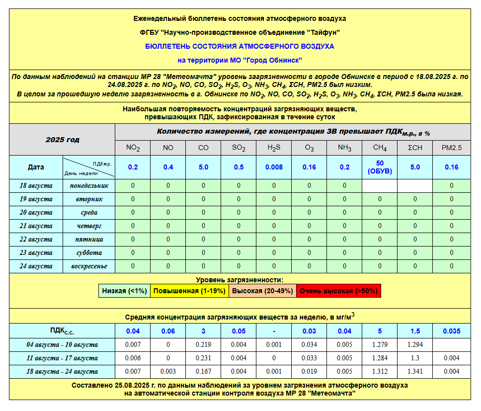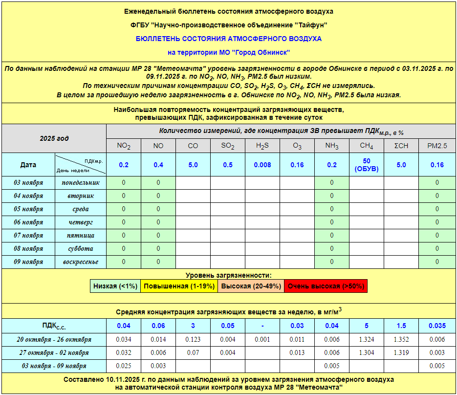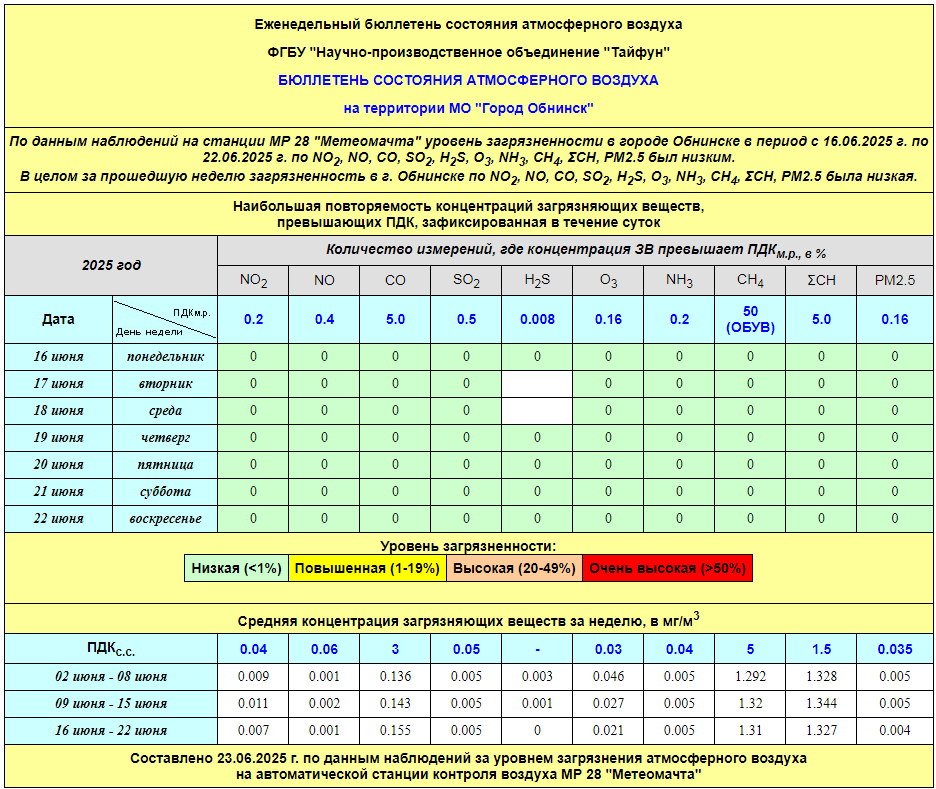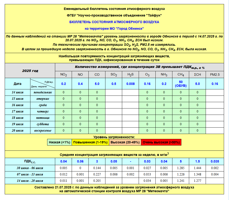 По информации, предоставленной ФГУП НПО «Тайфун», отмеченные в бюллетене состояния атмосферного воздуха на территории МО «Город Обнинск» превышения концентрации по H2S (сероводород) за период с 08.02.-12.02. связаны с некорректной работой прибора. В настоящее время проводятся работы по технической диагностике прибора.