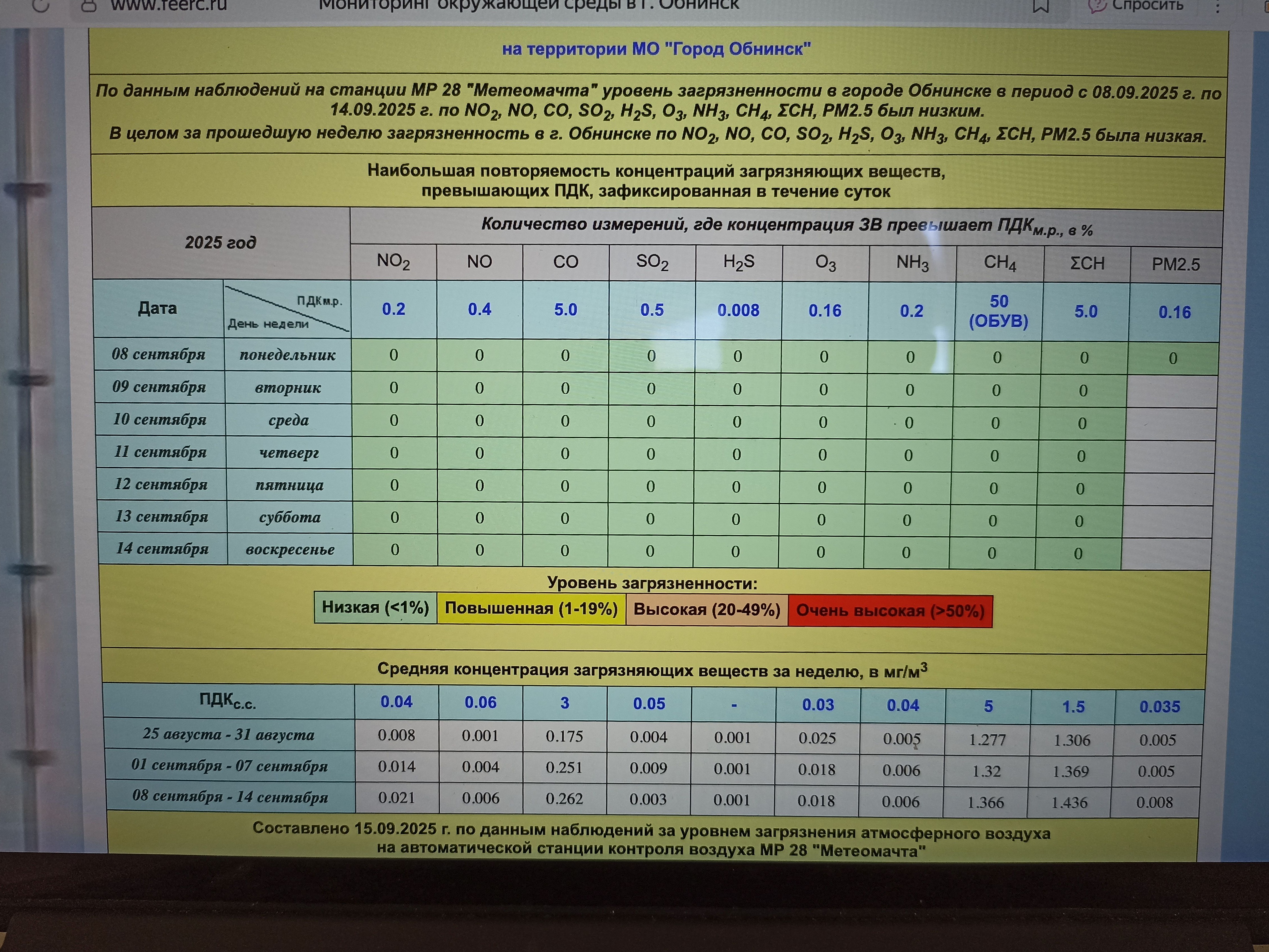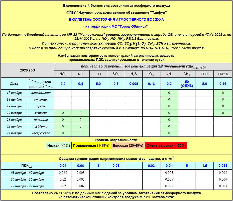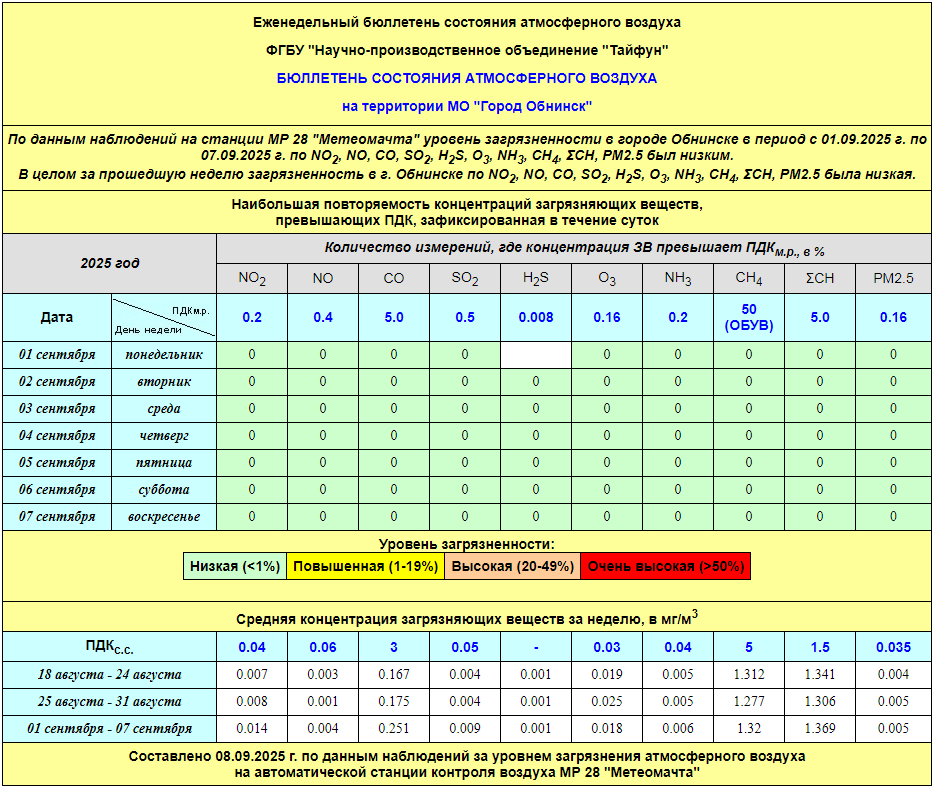Уровень загрязнения атмосферного воздуха в г.Обнинске оценивается как низкий по ИЗА=2,8 (индекс загрязнения атмосферы).