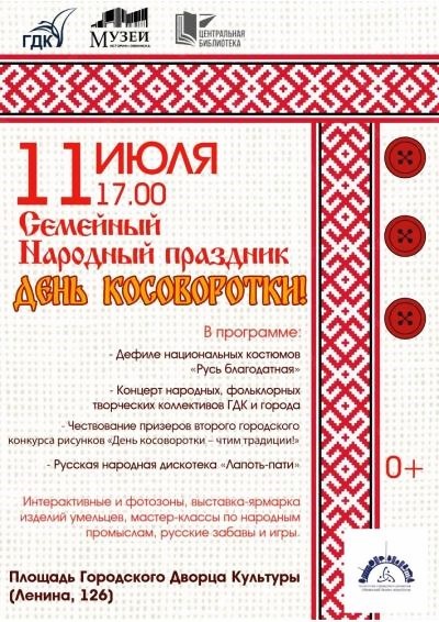 В программе: чествование победителей конкурса рисунков «День Косоворотки – чтим народные традиции!», веселые хороводы, яркие танцы от хореографических коллективов Городского Дворца Культуры, звонкие песни от вокальных коллективов, дефиле национальных костюмов «Русь благодатная», зажигательная русская народная дискотека «Лапоть-пати», интересные мастер-классы по изготовлению кокошников и игре на нетрадиционных народных инструментах, а также ярмарка-продажа рукодельных товаров от народных мастеров костюмов «Русь благодатная», зажигательная русская народная дискотека «Лапоть-пати», интересные мастер-классы по изготовлению кокошников и игре на нетрадиционных народных инструментах, а также ярмарка-продажа рукодельных товаров от народных мастеров.
