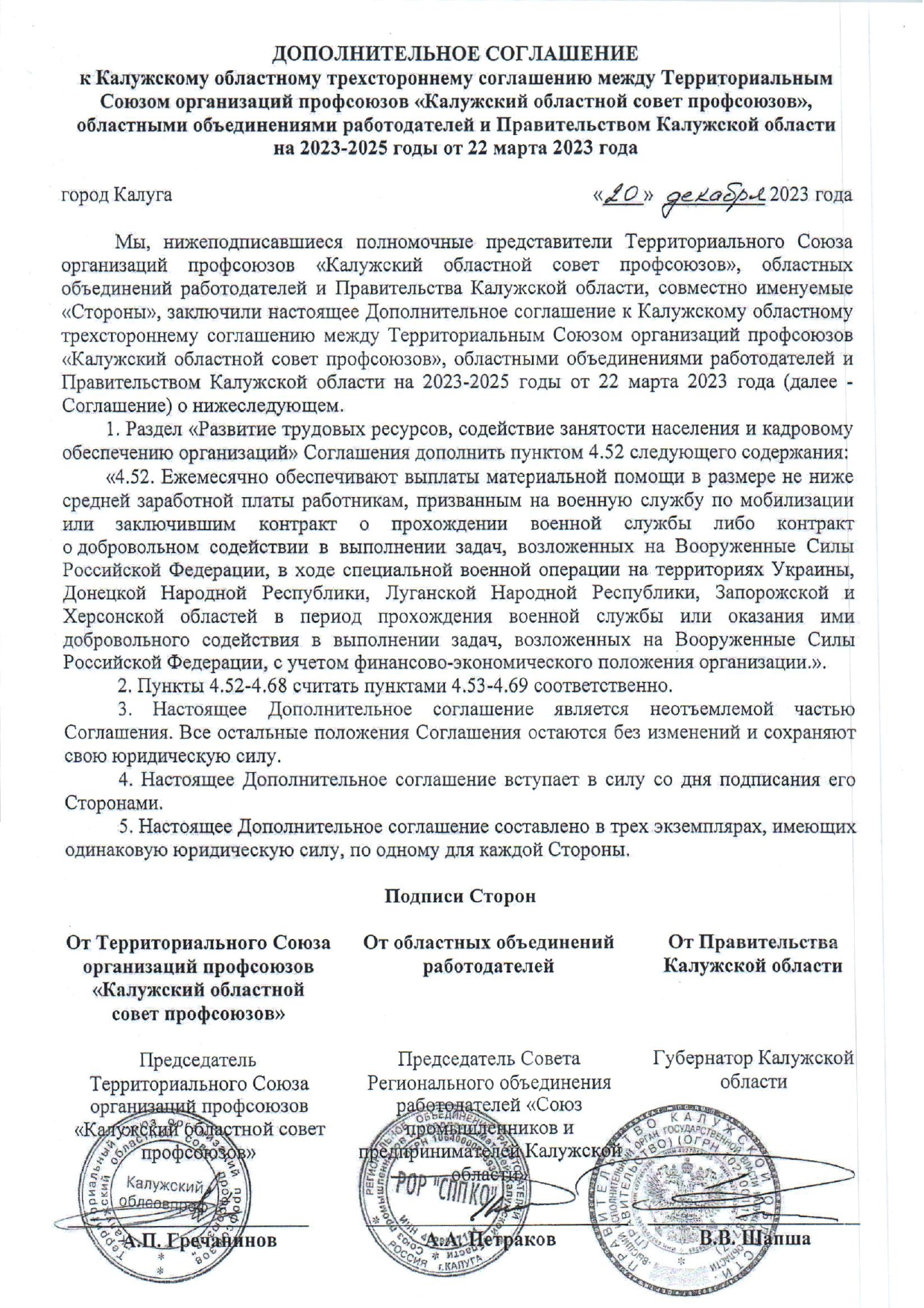 Дополнительное соглашение к Калужскому областному трехстороннему соглашению между Территориальным Союзом организаций профсоюзов «Калужский областной совет профсоюзов», областными объединениями работодателей и Правительством Калужской области на 2023-2025 годы от 22 марта 2023 года