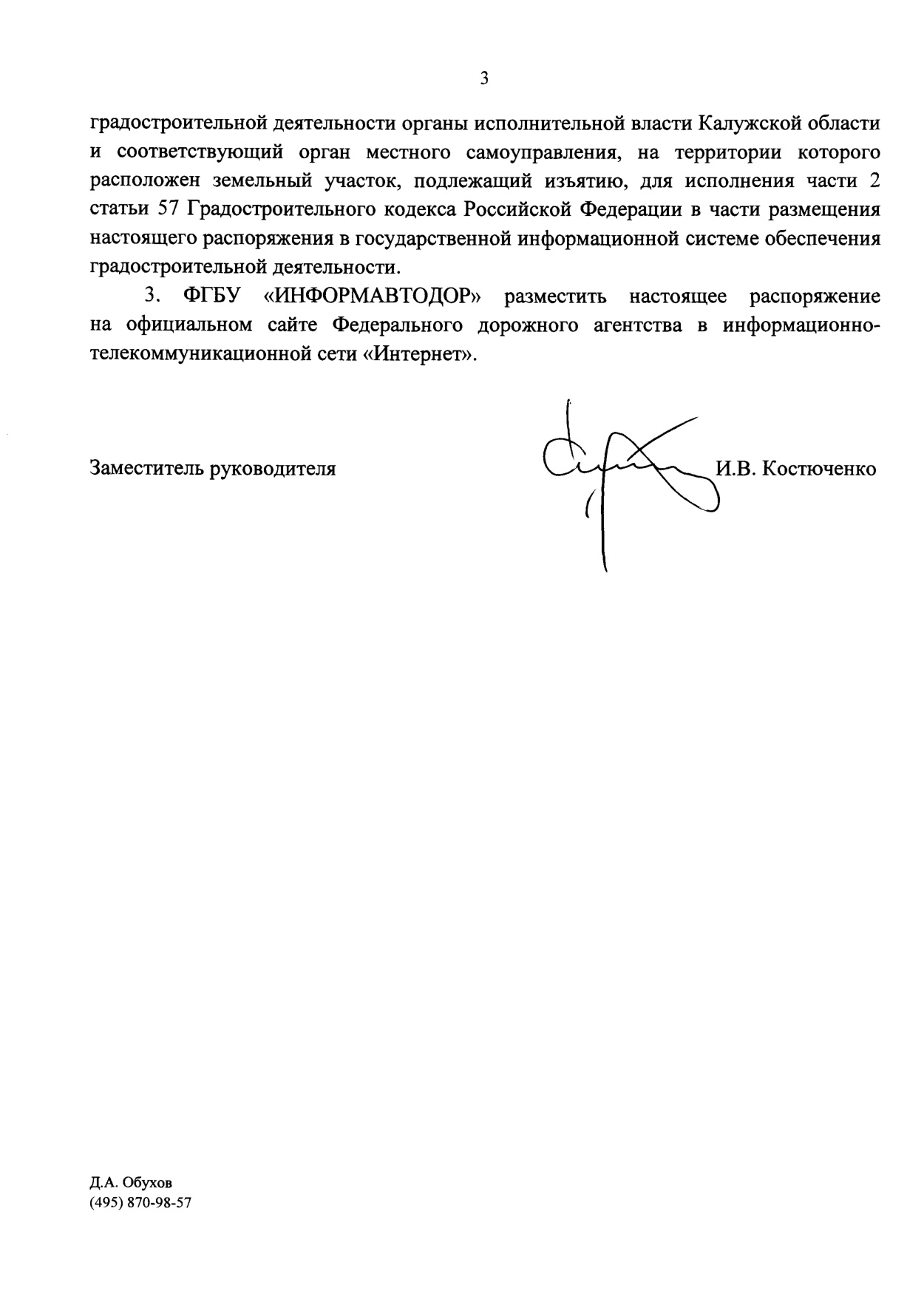 • Распоряжение Министерства транспорта РФ Федерального дорожного агентства (РОСАВТОДОР) от 15.04.2024 № 941-р «Об изъятии для нужд Российской Федерации земельного участка в целях обеспечения реализации проекта «Автомобильная дорога М-3 «Украина»-Москва-Калуга-Брянск-граница с Украиной. Реконструкция с последующей эксплуатацией на платной основе федеральной автомобильной дороги М-3 «Украина» - от Москвы через Калугу, Брянск до границы с Украиной (на Киев), участок км 37 - км 173, Московская и Калужская области» 2.2 этап строительства – км 65 – км 124»