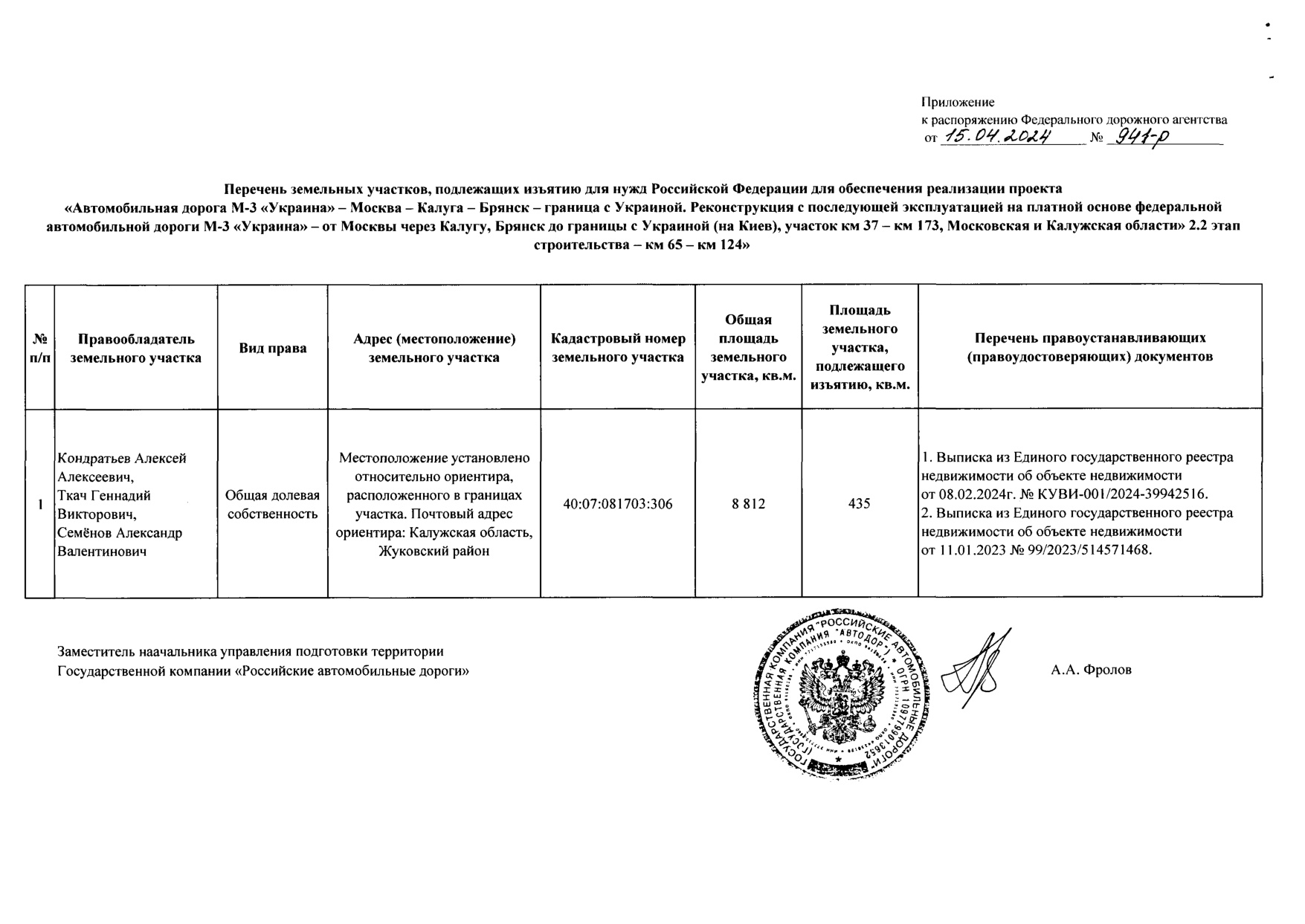 Распоряжение Министерства транспорта РФ Федерального дорожного агентства (РОСАВТОДОР) от 15.04.2024 № 941-р «Об изъятии для нужд Российской Федерации земельного участка в целях обеспечения реализации проекта «Автомобильная дорога М-3 «Украина»-Москва-Калуга-Брянск-граница с Украиной. Реконструкция с последующей эксплуатацией на платной основе федеральной автомобильной дороги М-3 «Украина» - от Москвы через Калугу, Брянск до границы с Украиной (на Киев), участок км 37 - км 173, Московская и Калужская области» 2.2 этап строительства – км 65 – км 124»