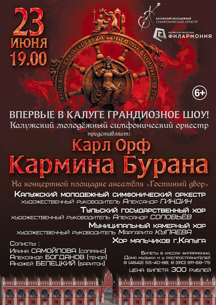 23 июня 2017 года в 19-00 на концертной площадке «Гостиный двор» (г.Калуга, ул.Ленина) будет реализован творческий проект "Карл Орф". «Кармина Бурана» при участии Калужского молодежного симфонического оркестра, Тульского государственного хора, Калужского муниципального камерного хора, хора мальчиков (г.Калуга), солистов московских ведущих театров.